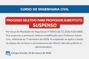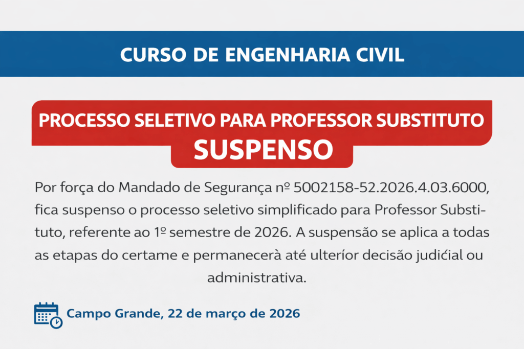 A Comissão Especial do Curso de Engenharia Civil da Faculdade de Engenharias, Arquitetura e Urbanismo e Geografia (FAENG) torna público o Edital de SUSPENSÃO do processo para seleção de candidatos a Professor Substituto para o primeiro semestre letivo de 2026. Clique no link para maiores informações.